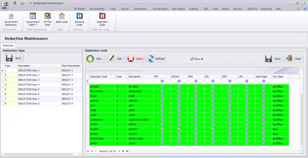 NO restrictions in setting up multiple Allowance or Deduction codes, in relation to government contribution and deduction such as EPF, SOCSO and Tax.